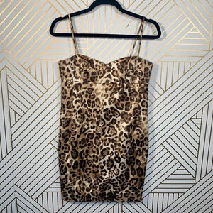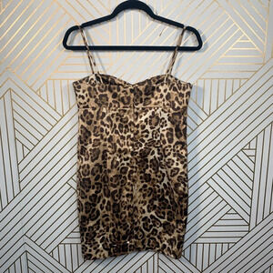 From the high end line of Michael Kors, this leopard print mini dress is super 90s and a perfect replacement for an LBD. Features a rust and black leopard print allover. Flattering sweetheart neckline with spaghetti straps and body hugging silhouette is timeless and goes from day to evening with ease. Lined. Made in Italy.