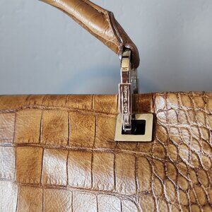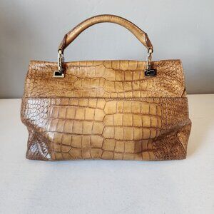 "EUC" Gorgeous Looking Croc Embossed Brown/Tan Leather Quinn Satchel By Michael Kors Collection. Single Top Handle with Removable 46" Chain & Leather Shoulder Strap, Flap Latch Closure with 3 Separate Compartments, 1 Large Center Zip & 1 Large Zip, 2 Slip Pockets, Front Slip /Pouch Under Flap and Large Slip Pocket at Back with Magnetic Snap, Pristine Grey Satin Textile Lining, Silver Tone Logo Hardware/ Minor Wear, Feeted Bottom, Bag Measures approx. 8.5" T X 14" Wide X 5" Deep, Great Condition, No Wearing/Corners/Stains, Minor Markings Normal Light Use Rt.1395.00 (Original Tag)