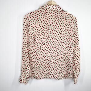 Crimson red off white button down top. Allover floral print, long sleeves with button cuffs, collared neckline. Button front closure. 100% silk.