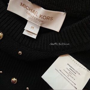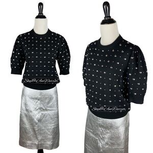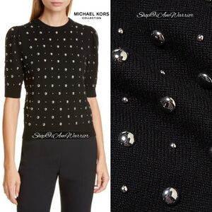 Michael Kors Collection (high end designer line) 100% Italian cashmere black puff sleeve pullover crewneck sweater adorned with polished silver tone studs is the luxury statement sweater you need this season. Pair with my J.Crew Collection silver leather skirt (shown here, sold separately) for a sophisticated look. EUC, retailed at $1,470! Value priced at $200 off. Size medium, see photos for measurements.