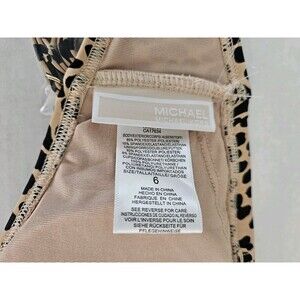 This is a Michael Kors swimsuit in size 6 with a convertible and adjustable bandeau swim top style featuring a cheetah animal print. It has a logo charm, optional straps, and built-in chest support with removable pads. The swimsuit is lined with a backless and sideless design, and is made of a stretchy material. Suitable for beach, cruise, or vacation wear.