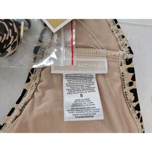 This is a Michael Kors swimsuit in size 8 with a convertible and adjustable bandeau swim top style featuring a cheetah animal print. It has a logo charm, optional straps, and built-in chest support with removable pads. The swimsuit is lined with a backless and sideless design, and is made of a stretchy material. Suitable for beach, cruise, or vacation wear.
