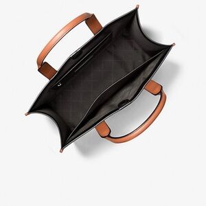 This Michael Kors briefcase in a rich brown leather exudes sophistication and professionalism. Its structured design and spacious main compartment make it ideal for work or business meetings. The smooth leather and minimal hardware enhance its timeless appeal. Stay organized all day long with this generously sized carryall, featuring our embossed brand lettering. Crisp and minimalist in its design, it boasts sturdy top handles and a compartment that’s large enough for your laptop, gym essentials and more. Two slip pockets at each side provide a perfect place to keep valuables like your keys and wallet within arm’s reach.