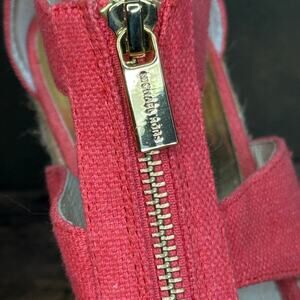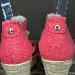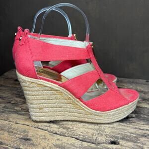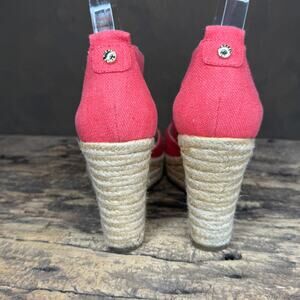 Add a pop of color to your summer wardrobe with these Michael Kors espadrille wedge sandals. Featuring vibrant coral canvas straps and a gold-tone front zipper, these wedges offer both chic style and stability. The jute-wrapped wedge platform gives a touch of coastal flair while elongating the silhouette — perfect for sunny days or resort wear.