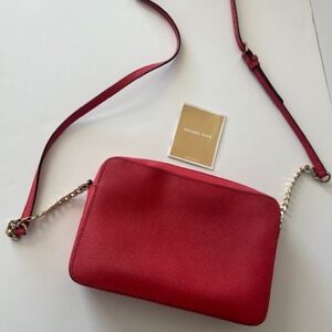 Michael Kors Jet Set Coral Crossbody Bag with Gold Hardware. Gold chain strap, hardware, and zip closure. Tan lined with multiple pockets. Lightly used, but in great condition. Non smoking home. Original retail value $258.