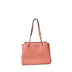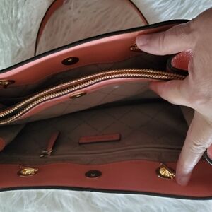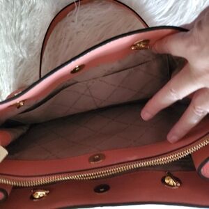 Elevate your style with the Michael Kors coral Leather Bag. This elegant accessory features a chic design perfect for any occasion. Crafted with high-quality materials, it offers both durability and sophistication. Please see measurements in photos. She did get some ink from an ink pen on the back of this bag. When she removed the ink, it made a spot on the bag. It is really hard to notice it but she knows it is there so she wanted to make sure you are aware that it is there also. Refer to last picture. The price does reflect this. From a smoke free home. Thank you for shopping with our family. We appreciate you!