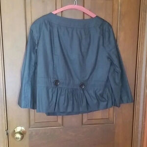 EUC Cropped 3/4 length sleeved cotton jacket. snap front with logo buttons. slash pockets. pleated back with button detail. this is from a smoke free pet free home.
