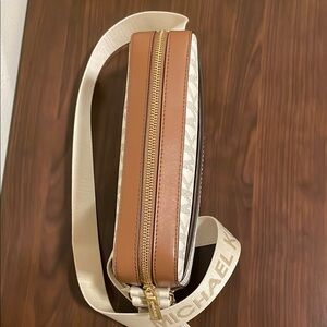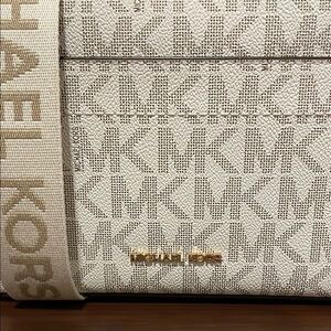 This Michael Kors crossbody bag in a sophisticated cream color showcases an all-over monogram print, offering a chic and modern look. The adjustable strap and gold-toned hardware add a touch of elegance, making it a perfect accessory for any stylish outing.
