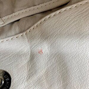 The leather has blemishes and peeling to it and the interior has staining inside of it including pen marks. The handles have discoloration to them.