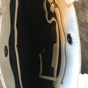 Satchel style bag in beautiful supple cream leather with black accents. Black interior lining. Interior contains one larger side zipper pocket and four additional pockets for phone, keys, etc. Bag is in great condition. There are a few tiny imperfections, just from being used but nothing even notable enough for a photo except small knick on handle (pictured). 💯 authentic!!