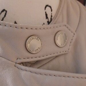 Stylish cream leather jacket. Features bold zipper accents. Perfect for layering.