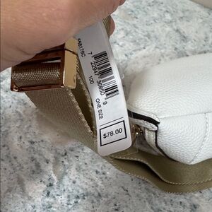Elegant cream leather waist bag with gold accents. Features a sleek design and secure zipper closure.