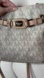 Elegant Michael Kors shoulder bag. Features signature logo pattern. Gold-tone hardware adds sophistication.