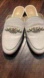 Chic cream mules featuring a stylish gold chain. Ideal for versatile wear. Can be dressed up or dressed down. These are not new and have been used, see images for wear. There are scuff marks along with some threading on the sides of the shoes coming undone. Beneath the gold headwear there are some marks but isn’t really noticeable unless the headwear is lifted. The shoes do seem to have been widened a bit. See photos and video for reference.
