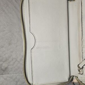Elegant cream wallet with signature MK pattern. Features a gold logo plate. Perfect for everyday use.