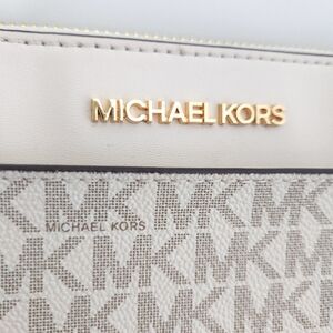 Cream off-white coated canvas with pebbled texture, brown signature MK logo, cream vegan faux leather strap, and black edges. Gold hardware. Adjustable crossbody strap is detachable (so can also be used as clutch handbag.