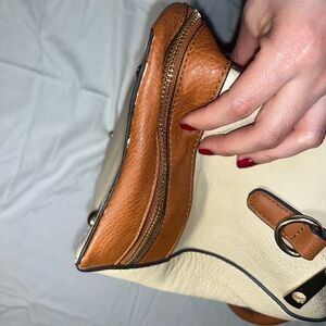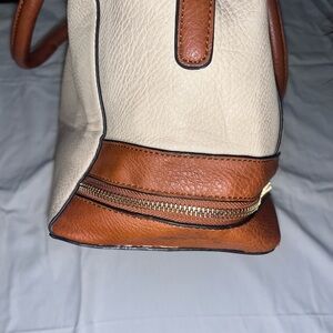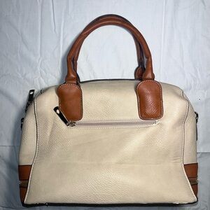 Stylish satchel with signature logo. Features rich brown accents. Perfect for everyday wear.
