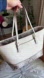 Chic shoulder bag with cream upper and brown snakeskin-patterned base. Elegant design for versatile use.