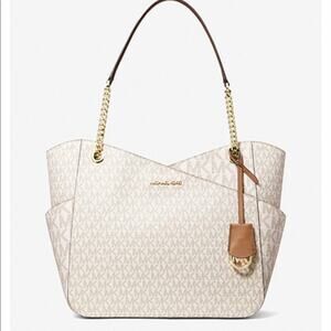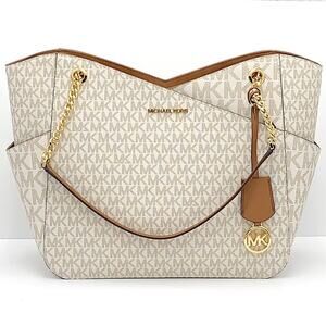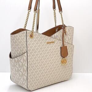 Stylish Michael Kors shoulder bag. Features cream MK pattern. Brown leather straps. Gold chain accents.