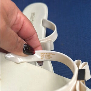 These Michael Kors sandals showcase a sophisticated cream and gold color scheme, ideal for elevating your summer style. The minimalist design features a comfortable footbed and a striking gold accent, perfect for casual outings. Crafted with precision, these sandals offer both elegance and comfort.
