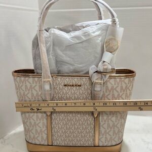 Chic tote with signature MK design. Cream and gold accents. Ideal for any occasion.