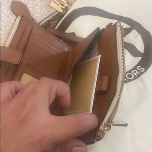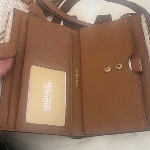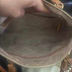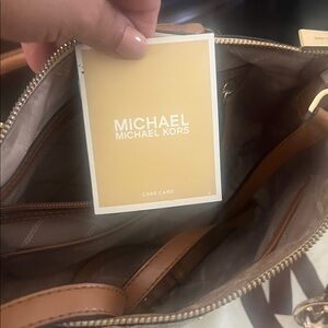 Stylish Michael Kors tote and pouch set. Features cream and tan design. Perfect for everyday use.