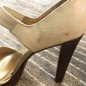 Very beautiful and comfortable chic high heel. Stretchy stap across the top for added comfort. Blemish on the side of one of the shoes.