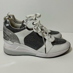 Michael Kors Crista Silver White Mixed Media Wedge Sneakers Glitter Women’s 9.5