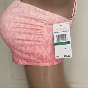 Stylish pink crop top with Michael Kors logo pattern. Features a unique strap design size L