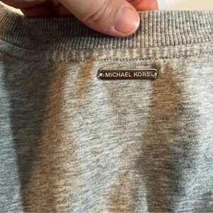 This super cozy cropped sweatshirt from Michael Kors has a smocked ruffle waist, longs sleeves and in a neutral gray color. It has the metal Michael Kors spellout on the back. It's a women's size large. Fabric make up: 57% cotton, 38% polyester , 5% elastane. Item is preowned and in excellent condition.