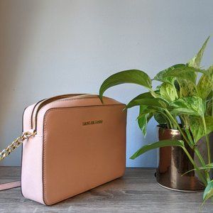 Michael Kors Brand: Pink crossbody purse. Structured in a clean-lined silhouette crafted from saffiano leather. Goldtone hardware speaks to a lock sensibility, while a spacious interior offers easy organization of your essentials.