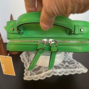 The Bag is palm green leather with silver hardware. The Bag is new with tag. The interior has credit card slots on one side and a slip pocket on the opposite side. The lining is Michael Kors embossed fabric. Only the Bag is included in the listing.