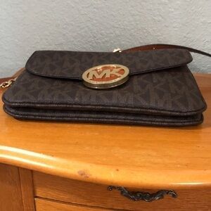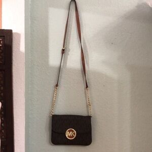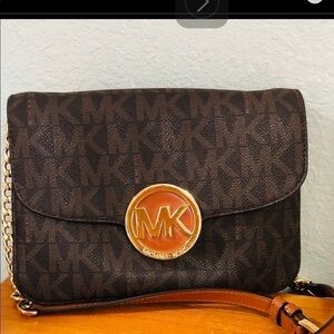 Michael Kors Fulton small Crossbody bag brown coated canvas with signature MK chain and leather strap gold tone hardware back has one large slip pocket front has snap flap inside has three sections back section has eight card slots middle section ,front section has one slip pocket adjustable crossbody strap