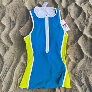 NWT Michael Kors Cyan Blue Bright Neon Yellow XS Zipper Racer Back Tankini Swim