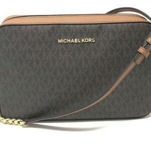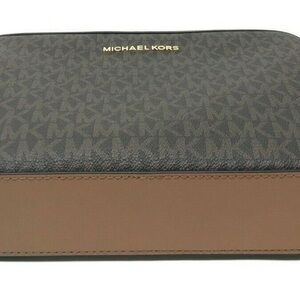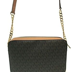 Stylish Michael Kors crossbody bag. Dark brown with gold chain strap. Perfect for any outing.