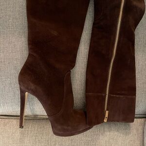 Chic heeled boots by Michael Kors. Dark brown suede with gold logo detail. Perfect for elevating any look.