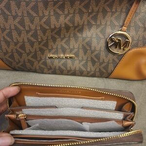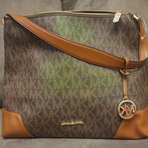 Stylish Michael Kors messenger bag set. Features dark brown design with signature pattern. Ideal for modern elegance.