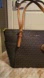 Elegant tote with iconic MK pattern. Dark brown with tan accents. Ideal for everyday style.