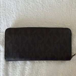 Elegant dark brown wallet by Michael Kors. Features a gold logo plate and zipper.