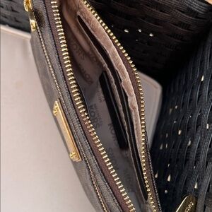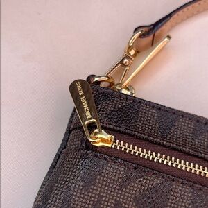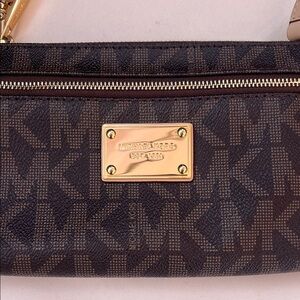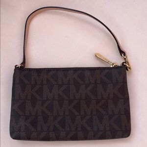 New with no tags Elegant Michael Kors wristlet in dark brown. Features gold-tone hardware and secure zip closure. Ideal for stylish outings. Measures approx 8x5