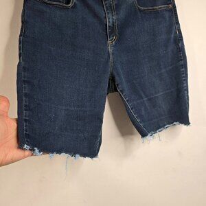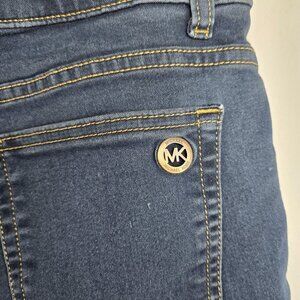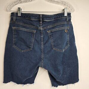 Michael Kors Dark Denim Stretch Raw Hem Cut Off Logo Bermuda Denim Shorts