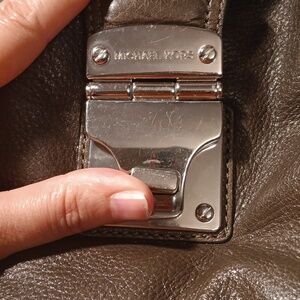 Stylish dark brown leather shoulder bag with silver hardware. Features a secure buckle closure and zippered pockets. Dark olive color, nice well made bag!