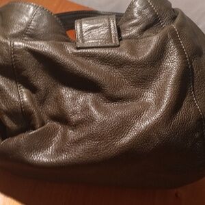 Stylish dark brown leather shoulder bag with silver hardware. Features a secure buckle closure and zippered pockets. Dark olive color, nice well made bag!