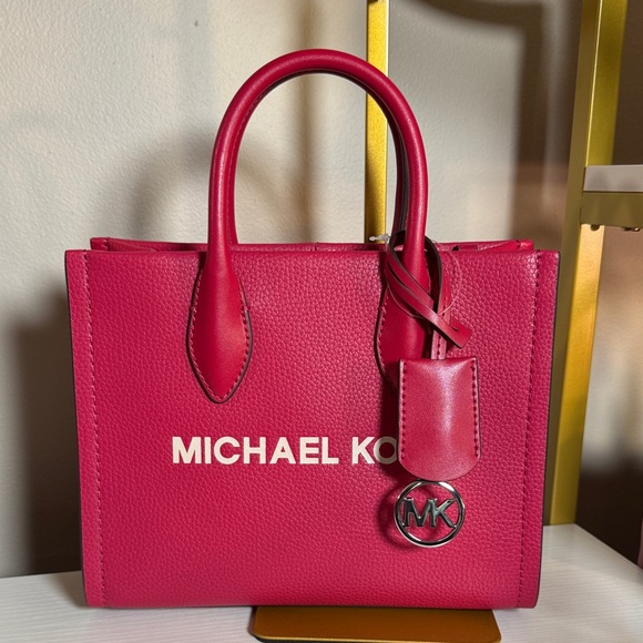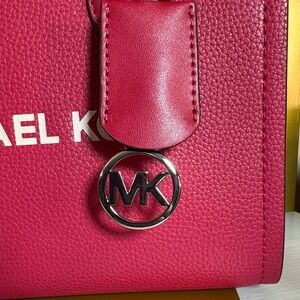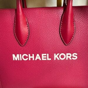 Chic Michael Kors tote in dark raspberry. Features signature logo charm. Ideal for everyday use.