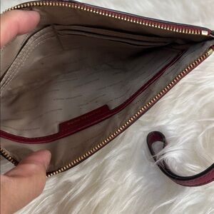 Elegant wristlet by Michael Kors. Dark red leather with gold star details and logo. Perfect for a chic look. Has card slots inside. Great for minimalist on the go. Measures approximately 7”x9.5”.