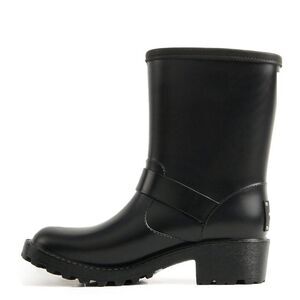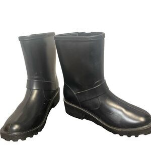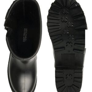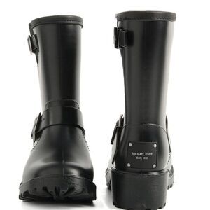 These sleek black gum boots from Michael Kors feature a mid-calf height and a smooth, glossy finish. Designed with two silver buckle straps for added style, they offer a sturdy sole for excellent traction. Perfect for making a bold statement, these boots combine fashion with functionality.