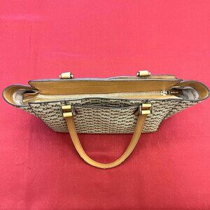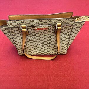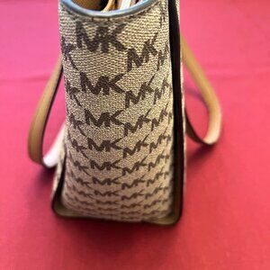 Michael Kors Dee Dee Brown And Creme Coated Canvas Leather Trim Bag. Good Condition. Bag Exterior Is In Excellent Condition. Straps Has Fraying On Edges. Small Stain Inside. Bottom Feet Have Slight Wear. Shoulder Strap Not Included.