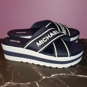 MICHAEL Michael Kors Demi-Logo Black slide platform sport sandals with white logo straps. Ideal for casual wear. Excellent preloved condition. 😎🖤
