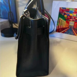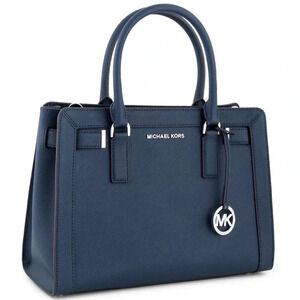 Michael Kors Dillon Saffiano Leather Satchel size medium in Navy Blue. Bag has been crafted of Michael Kors signature durable luxe saffiano leather exterior in Navy Blue with silver hardware including parts on handles and protective feet. Interior has several pockets, one zippered pocket and dust bag included.