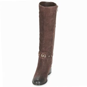 Michael Kors Distressed Suede Leather Riding Tall Boot with Block Heel - classic style riding boot with bold gold tone MK logo on the front. Gold hardware for zipper and buckle accents.